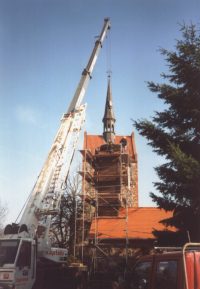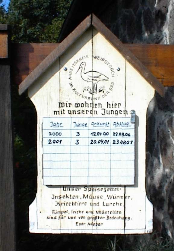 ![]() August Jetzt machen die Jungstörche die ersten Flugübungen. Bald sind sie weg, na dann bis zum nächsten Jahr. Juli Es sind drei Störche, und sie sind schon so groß, daß die Eltern auf den benachbarten Dächern schlafen. Der Störchen-Vater auf unserem und die Storchen-Mutter auf dem des Nachbarn. Mai/2000 nach neusten Informationen sind es drei Jungstörche Sie haben es angenommen Die Eier werden jetzt ausgebrütet und mal sehen wie viele Jungstörche es in diesem Jahr werden. Neues Nest Nach dem das Feuerwehrhaus renoviert wurde, mußte das Nest wieder an seinen Platz. Aber es fiel eine Woche später runter. Zum Glück waren da die Störche noch nicht hier. Dann wurde ein neuer Korb als Grundlage für den Nestbau auf dem Dach montiert. |